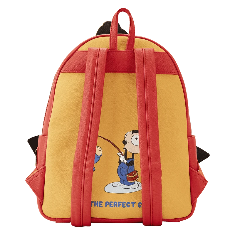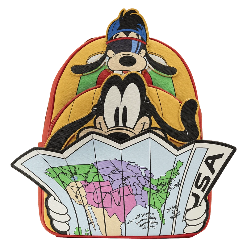 The Loungefly A Goofy Movie Road Trip Mini Backpack is made of vegan leather (polyurethane). Bag has adjustable shoulder straps and sturdy metal hardware. Additional features include applique and printed details. Take note of the coordinating inside lining.