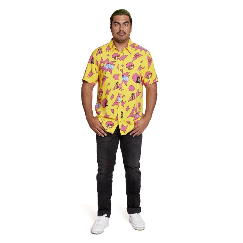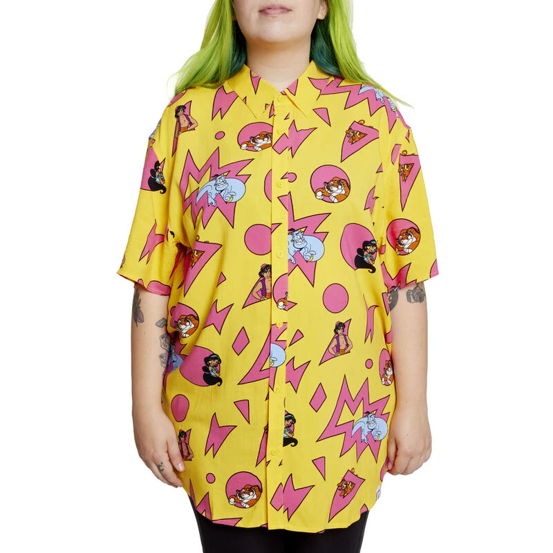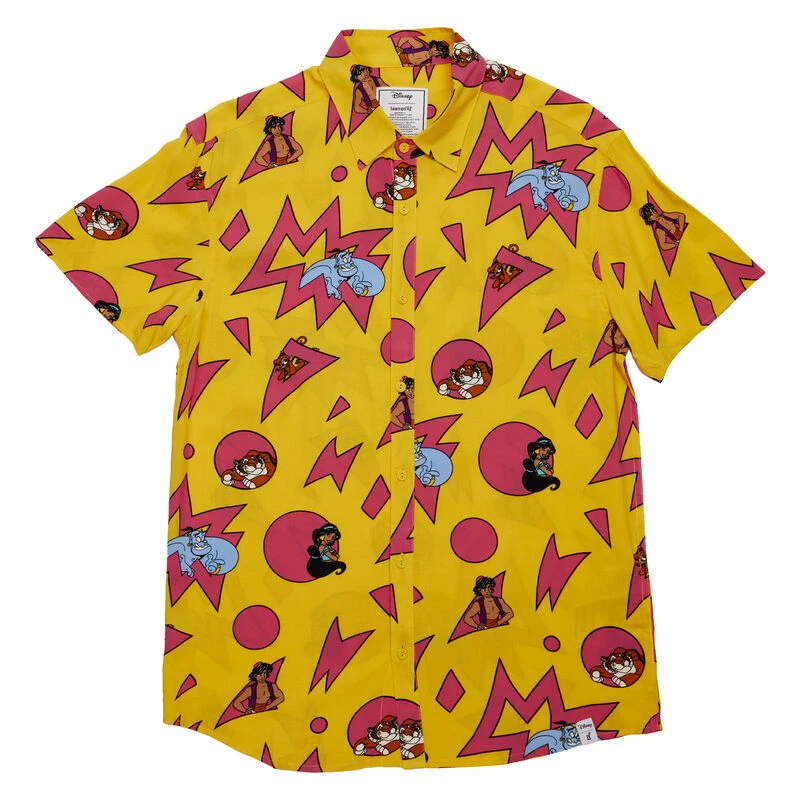 Capture the fun and magic of Aladdin and feel free to take it wherever you go with this Loungefly Disney Aladdin Genie Camp Shirt. The all-over-print, designed in-house by Loungefly artists, is a nod to the motif of the shirt Genie wears when he gains his freedom and retires. Aladdin, Genie, Jasmine, Abu, and Raja appear in the design, peeking out through splashes of fun shapes. Buttons along the center front allow for versatile wear. You could leave it buttoned up or add a tee with a pop of color underneath. This short-sleeve shirt will keep you cool and stylish on any adventure.