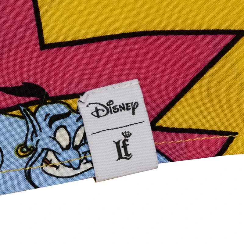 The Loungefly Aladdin Genie Camp Shirt is 100% Rayon print with original, in-house art.