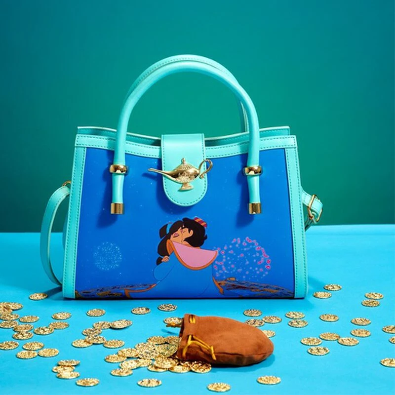 Open up a whole new world on the fly with this Loungefly Disney Aladdin Princess Scenes Crossbody Bag. Poof! A change of scenery is right at hand, with just a flick of wrist. Enjoy magical adventures with this bag, which is filled with original in-house created art on every side. On the front, Princess Jasmine and Aladdin share a romantic kiss on the Magic Carpet. A shiny gold metal lamp on the front clasp shimmers. On the left-side panel Abu swings from a tree, and on the right-side panel, Jafar appears to scheme. On the back, Genie is released in full force from the lamp. It’s the perfect accessory for a magical Disney trip, or for turning everyday outings into wish-filled adventures.