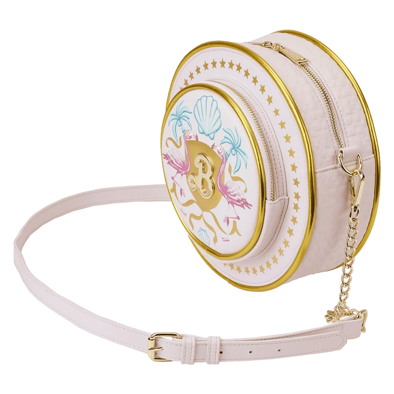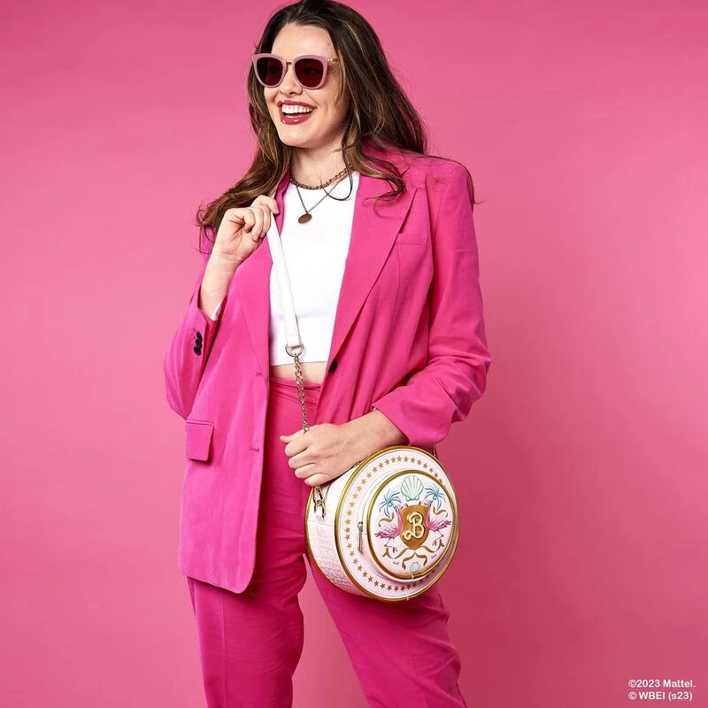 The Loungefly Mattel Barbie: The Movie Logo Crossbody Bag is made of vegan leather (polyurethane). Bag has a gold chain with an adjustable shoulder strap (detachable) and sturdy gold-colored metal hardware. Additional features include applique, debossed, gold foil, and printed details. Take note of the coordinating inside lining.