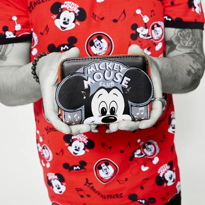 The Loungefly Disney100 Mickey Mouse Club Zip Around Wallet is made of vegan leather (polyurethane). Wallet zips closed with sturdy metal hardware and includes four slots for holding cards with a clear slot to hold ID. Additional features include applique, embroidered, and printed details. Take note of the coordinating inside lining.