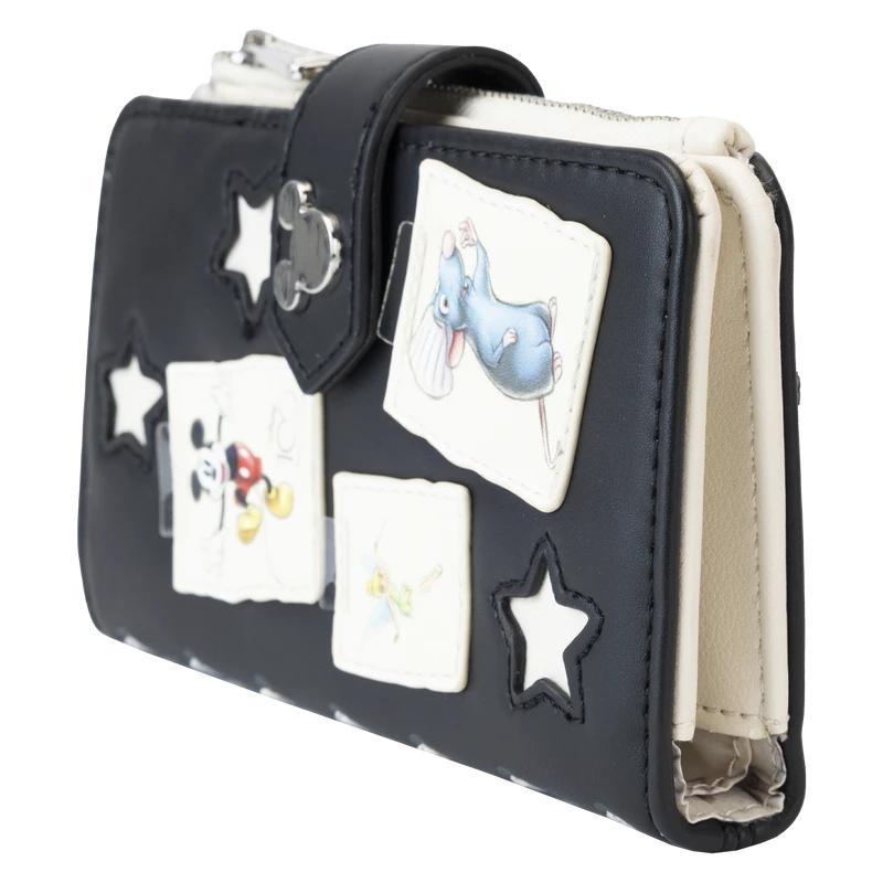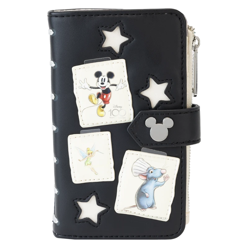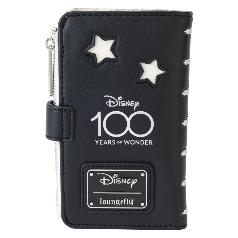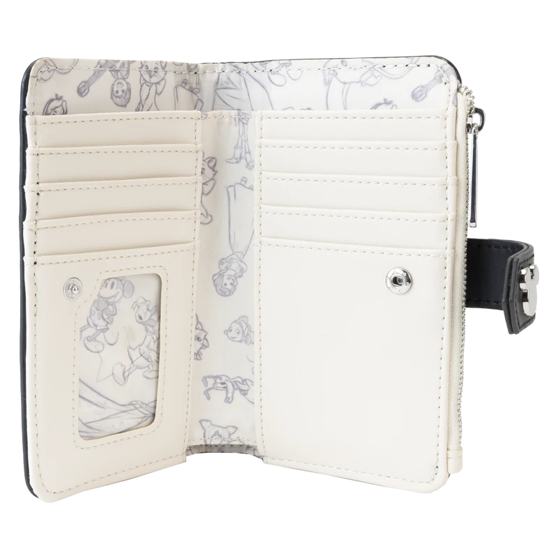 The Loungefly Disney100 Sketchbook Flap Wallet is made of vegan leather (polyurethane). This bifold wallet has sturdy silver-colored metal snaps and zippers to keep everything in place. Additional features include applique, printed, and PVC details. Take note of the coordinating inside lining.