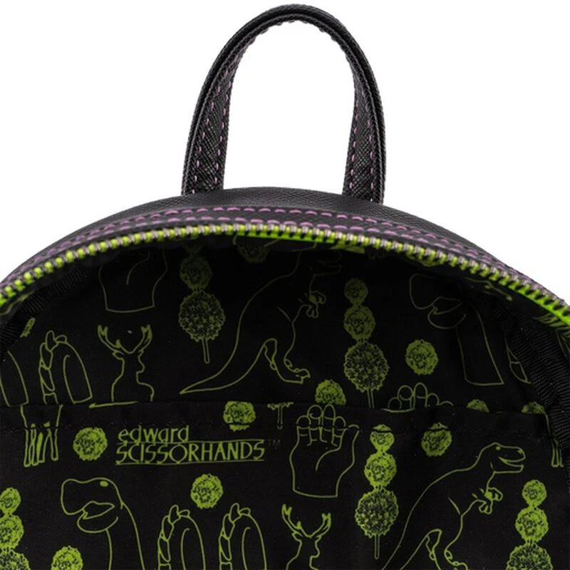 The Edward Scissorhands Topiaries Mini Backpack is made of vegan leather (polyurethane). Bag has adjustable shoulder straps, sturdy metal hardware, and features: chenille applique, and printed details. Take note of the coordinating pattern of the inside lining fabric.