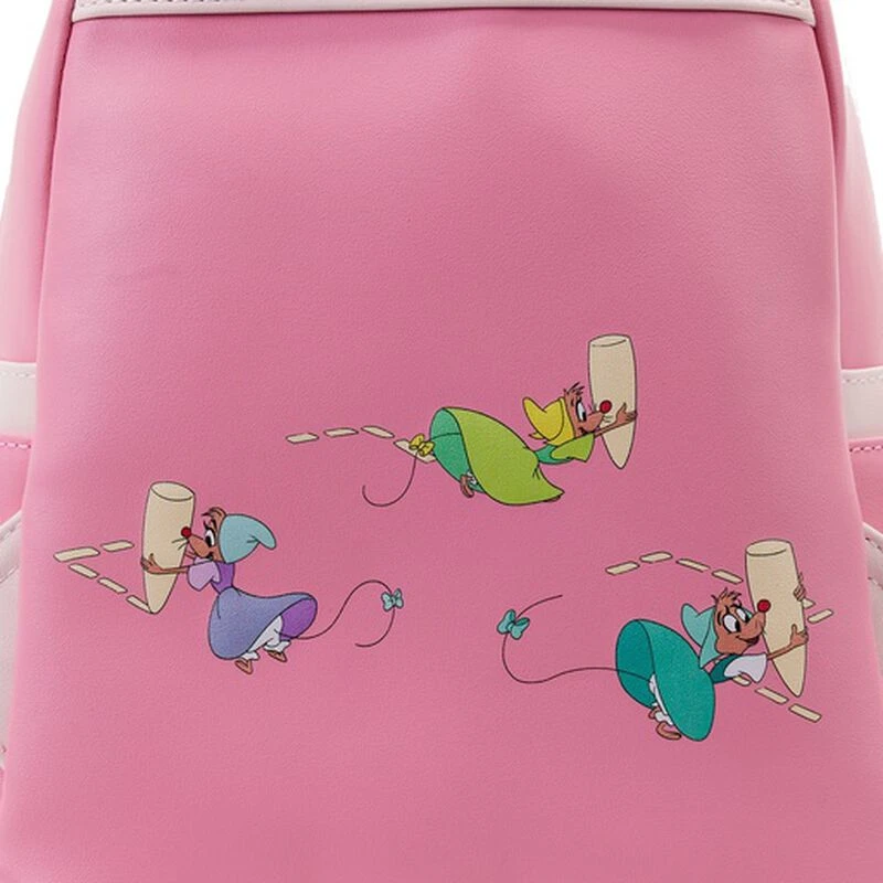 The Los Angeles Comic Con Exclusive Loungefly Cinderella Mice Dressmakers Mini Backpack is made of vegan leather (polyurethane). Bag has adjustable shoulder straps and shiny gold hardware. Additional features include applique, debossed, and printed details. Take note of the coordinating inside lining.