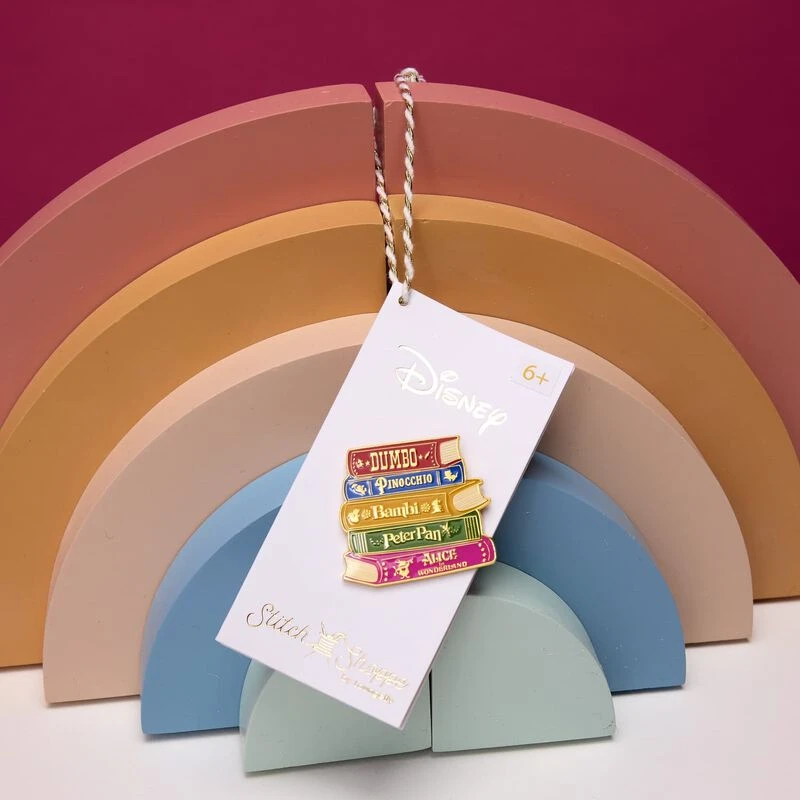 Each bag also comes with a matching enamel pin of Disney Classics books, which is approximately 1.5 inches tall, with shiny gold hardware and the classic Loungefly/Funko crown debossing on the back. This pin is only available with this Stitch Shoppe by Loungefly collection!