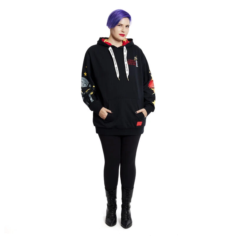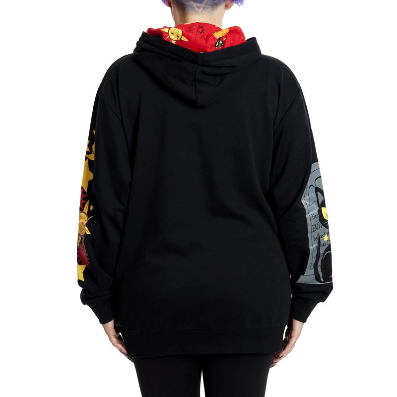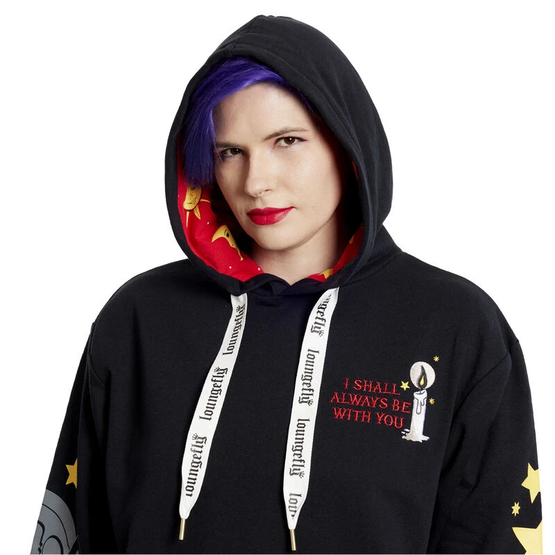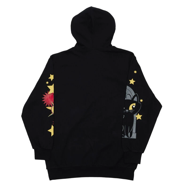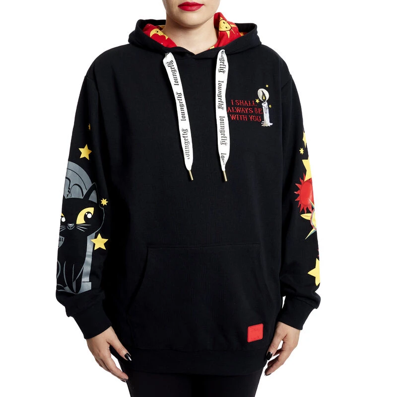 Celebrate the magic of All Hallows Eve with the Loungefly Hocus Pocus Binx Hoodie. This charmingly cozy hoodie pays tribute to the special bond between Thackery Binx and Dani Dennison from Disney’s Halloween classic, Hocus Pocus. On the front, the phrase “I shall always be with you” is displayed next to an embroidered black flame candle. The left sleeve features Thackery Binx in his black cat form, while the right sleeve shows sun, moon, and star motifs inspired by Dani’s witch costume. With original artwork and screen-printed details, this hoodie will keep you comfortable and stylish as you run amuck on your adventures.