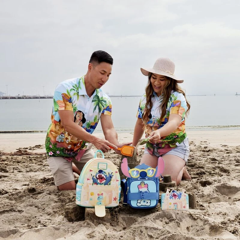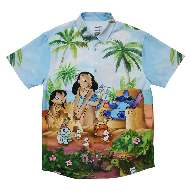 Say Ohana with our Loungefly Disney Lilo & Stitch Beach Scene Camp Shirt. A colorful scene plays out as Stitch makes himself at home in a chair of sand, where he relaxes with a tropical drink. Meanwhile, Nina helps Lilo build a sandcastle, and all around them, lush palm trees flourish overhead. Adorable ducks appear to gather around the beach bucket as well. Make a fashionable escape from the everyday routine with this comfy, button-down, short-sleeved shirt.