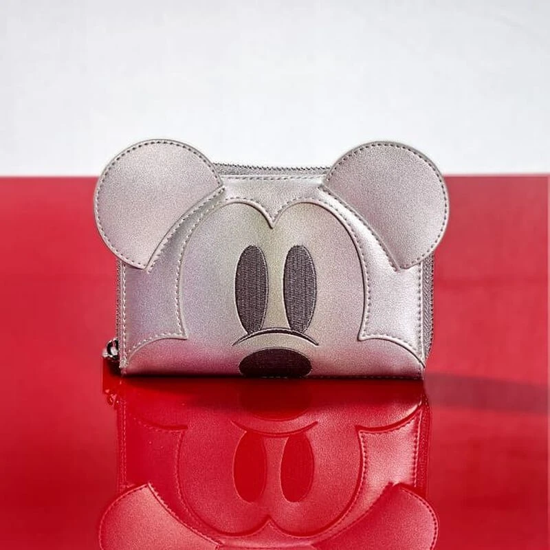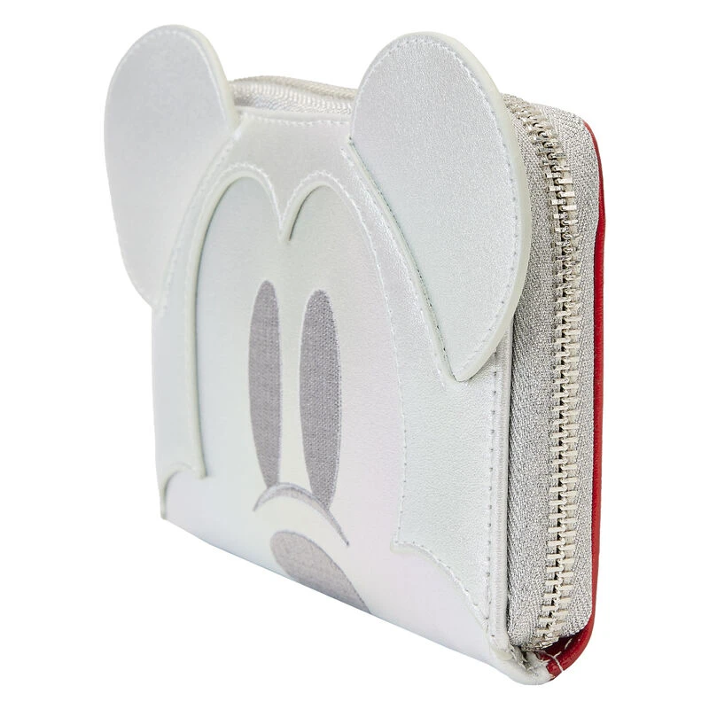 The exclusive Loungefly Disney100 Platinum Mickey Mouse Cosplay Zip Around Wallet is foil printed with vegan leather (polyurethane) trim. Wallet zips closed with sturdy metal hardware. Additional features include applique, debossed, and printed details. Take note of the coordinating inside lining.