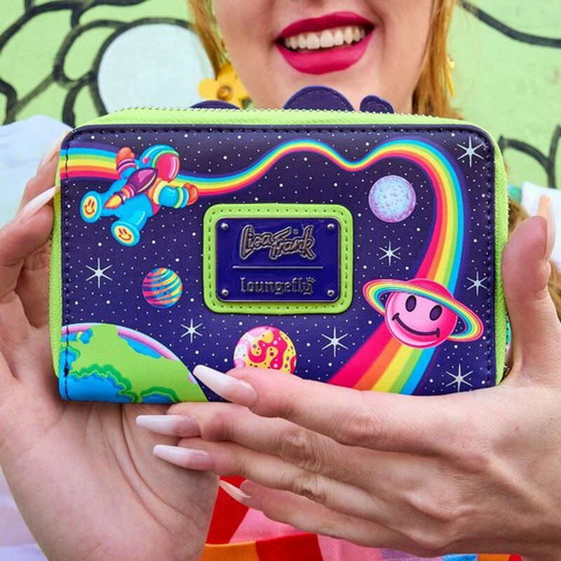 The Loungefly Lisa Frank Cosmic Alien Ride Zip Around Wallet is made of vegan leather (polyurethane) with shiny PVC details. Wallet zips closed with sturdy metal hardware. Additional features include applique, shiny PVC, glow-in-the-dark, and printed details. Take note of the coordinating inside lining.