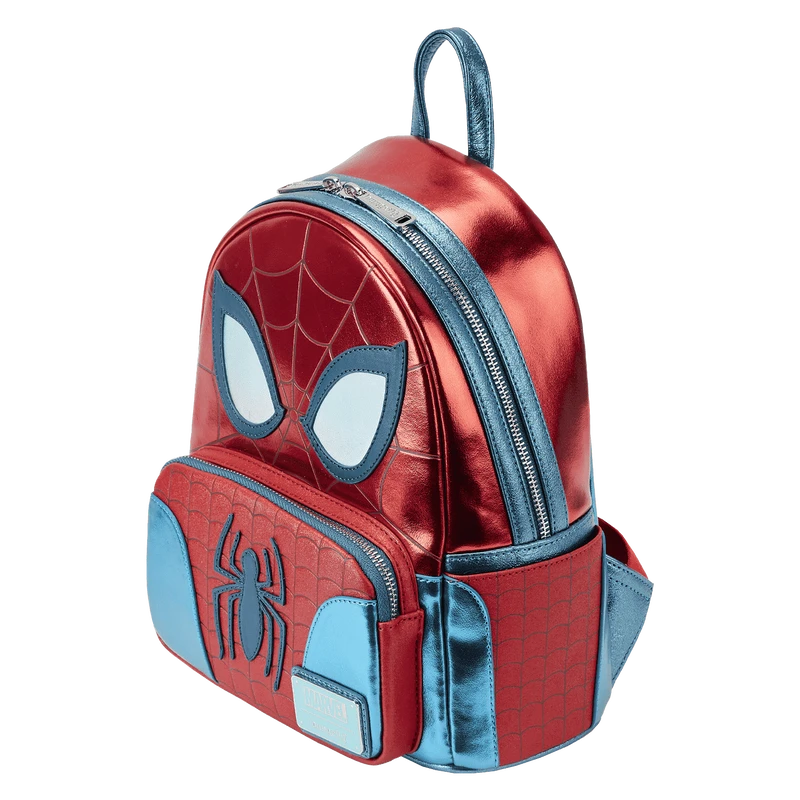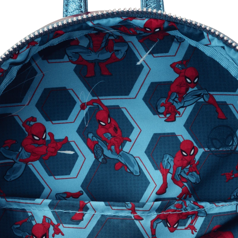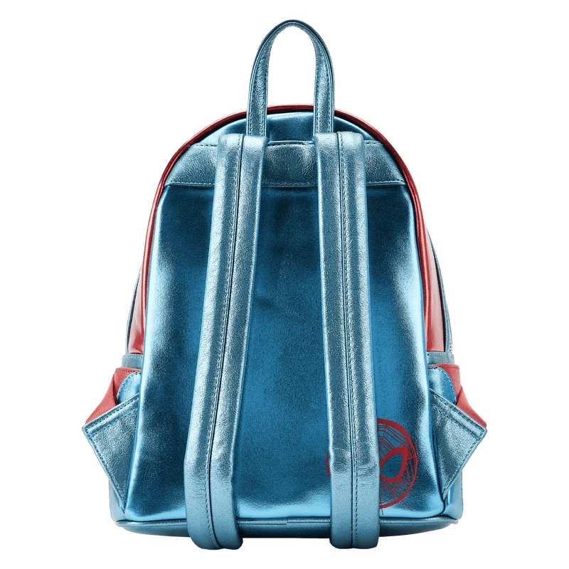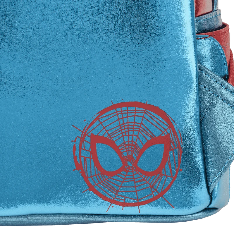 The Loungefly Marvel Metallic Spider-Man Cosplay Mini Backpack is made of vegan leather (polyurethane). Bag has adjustable shoulder straps and sturdy metal hardware. Additional features include applique, holographic, debossed, glitter, and printed details. Take note of the coordinating inside lining.