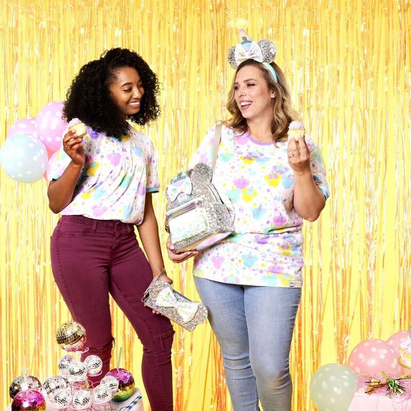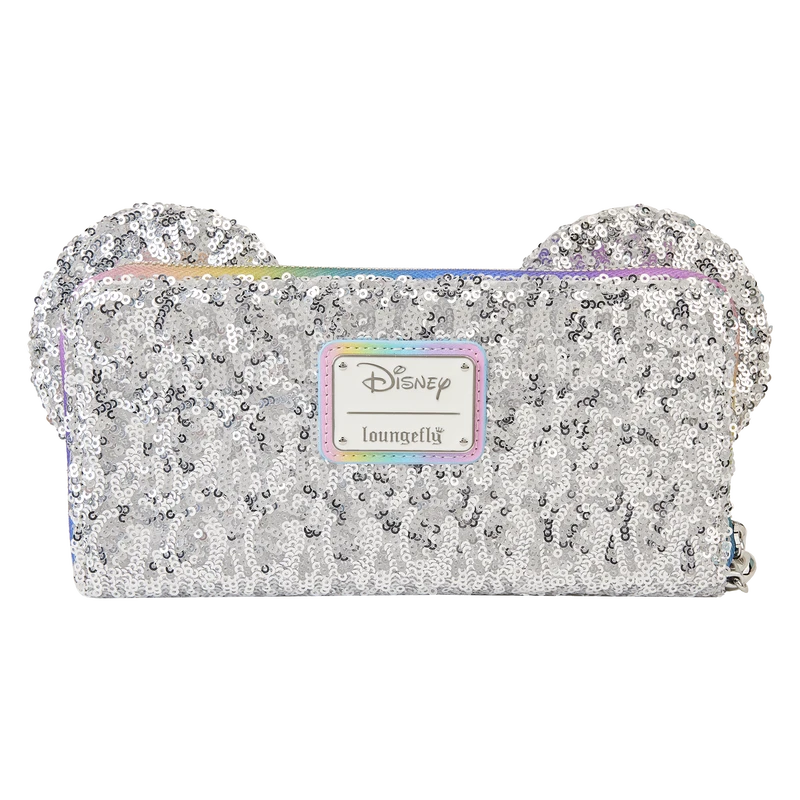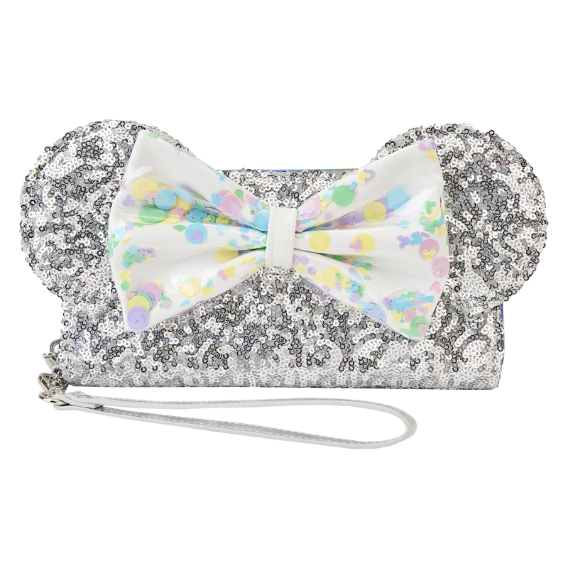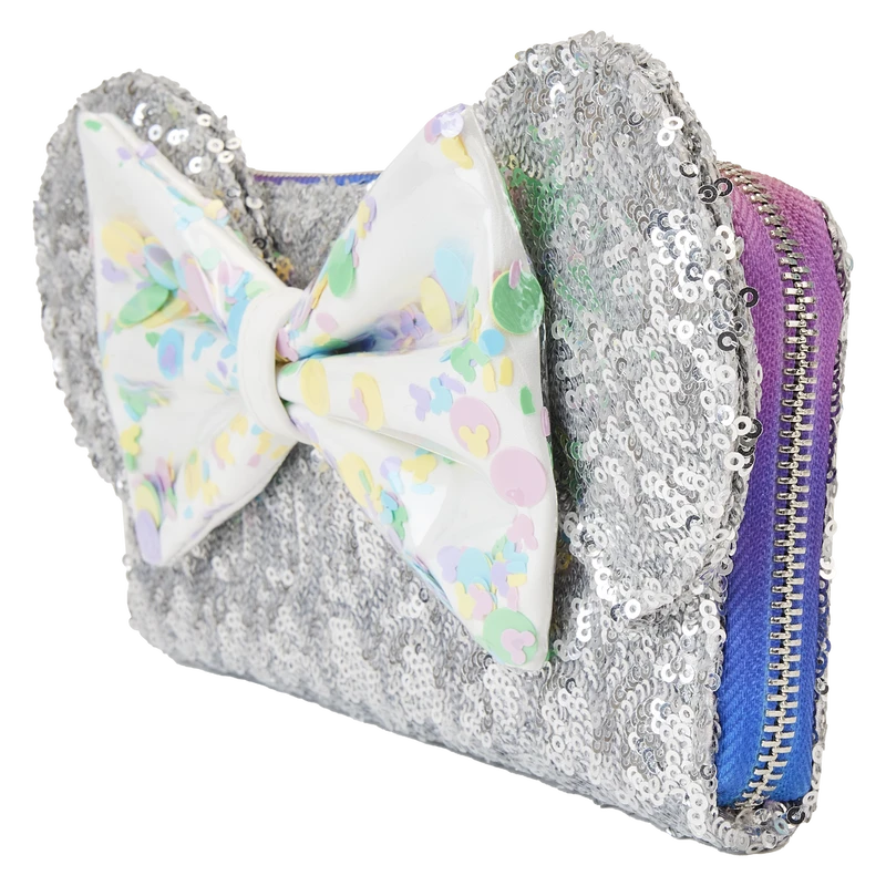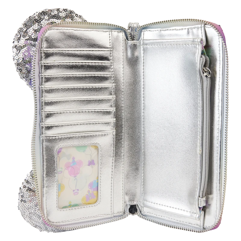 The Loungefly Disney Mickey Mouse and Friends Birthday Celebration Zip-Around Wallet is made of vegan leather (polyurethane). Wallet zips closed with shiny silver-colored metal hardware. Additional features include applique, PVC, sequin, 3D bow, and printed details. Take note of the coordinating inside lining.