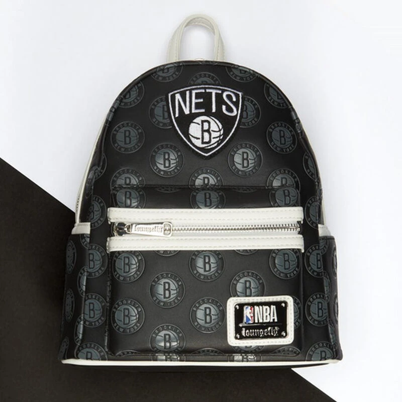 Create a winning game plan that shows your team spirit with this NBA Brooklyn Nets Logo Mini Backpack. The embroidered logo patch for the Brooklyn Nets prominently appears above the front zipped compartment. The logo includes a shield, with the word “NETS” arcing over a white basketball, with a black “B” in the middle. A debossed motif of another Brooklyn Nets logo—a black B encircled by the words “Brooklyn New York” in all capital letters— is set against a black background. White trim adds accent and contrast in team uniform color.