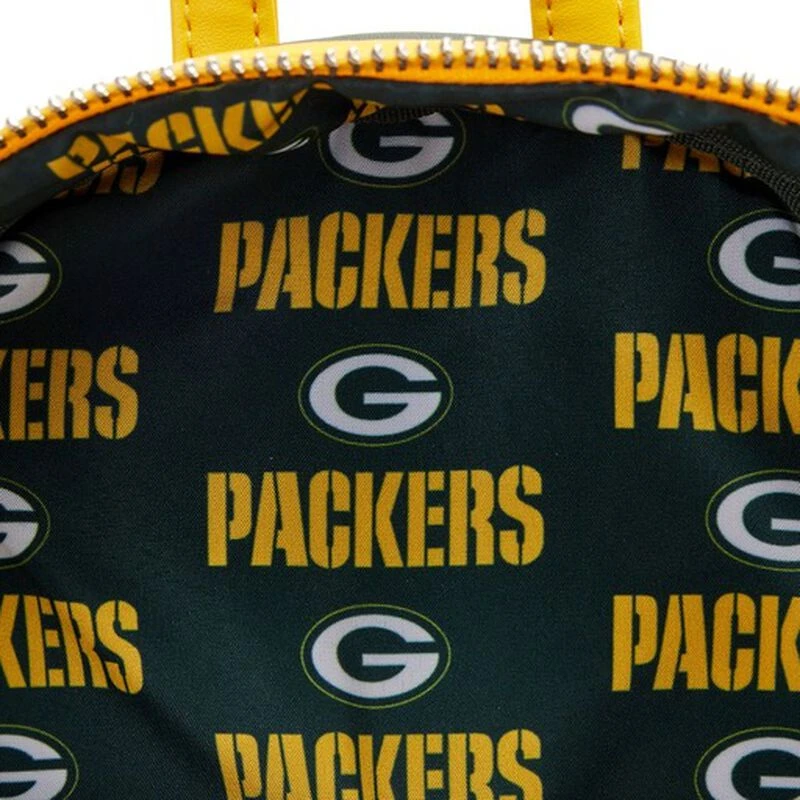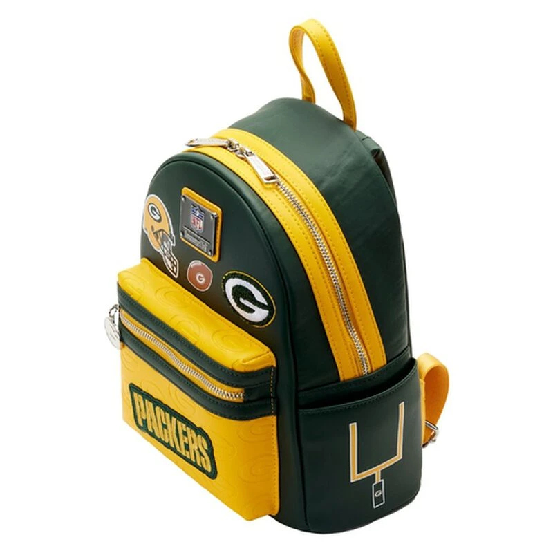 The Loungefly NFL Green Bay Packers Patches Mini Backpack is made of vegan leather (polyurethane). Bag has adjustable shoulder straps and sturdy metal hardware. Additional features include applique patches, embroidered, debossed, and printed details. Take note of the coordinating pattern of the inside lining.