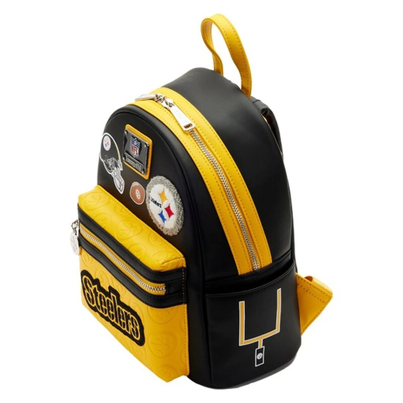 Show your team spirit with a game-winning play for your Loungefly collection! The NFL Pittsburg Steelers Patches Mini Backpack is a touchdown for any Steelers fan. This black backpack features sporty chenille and embroidered patches along the top and side pockets. The team’s logo is displayed in a debossed pattern across the front zipper pocket along with a rubber patch of the team’s name. An enamel Steelers zipper charm provides easy access to your gameday essentials, and the NFL logo appears on the back of the bag. This stylish mini backpack has plenty of room to carry your gear as you cheer from the sidelines and makes a sporty addition to any outfit.
