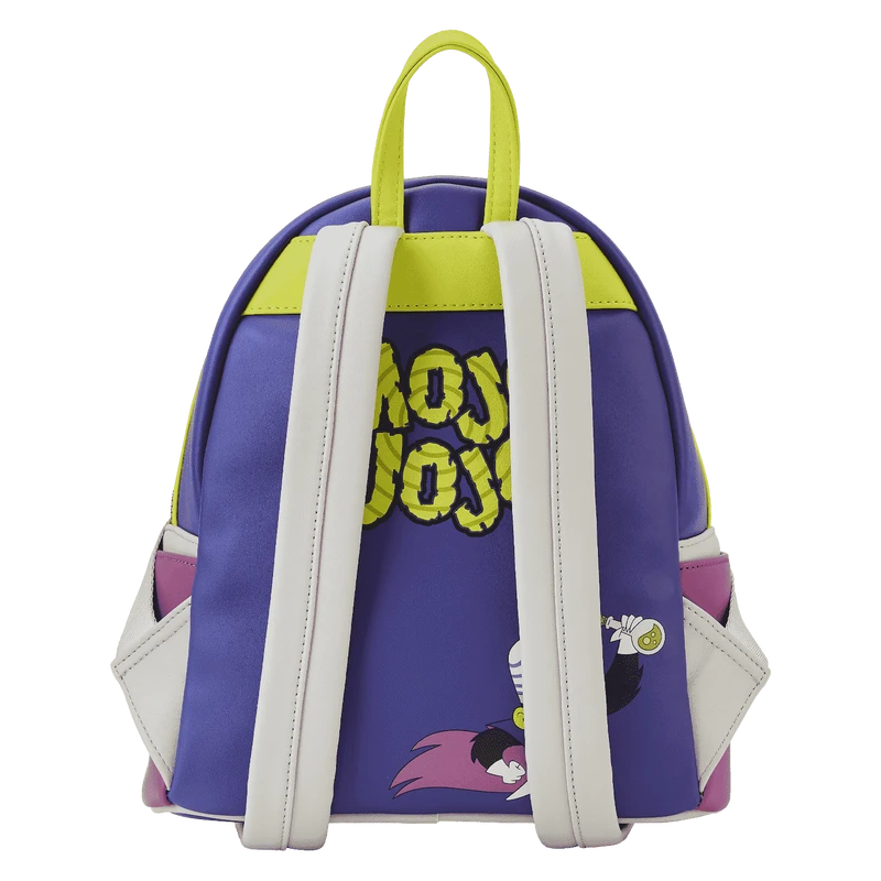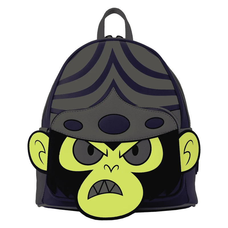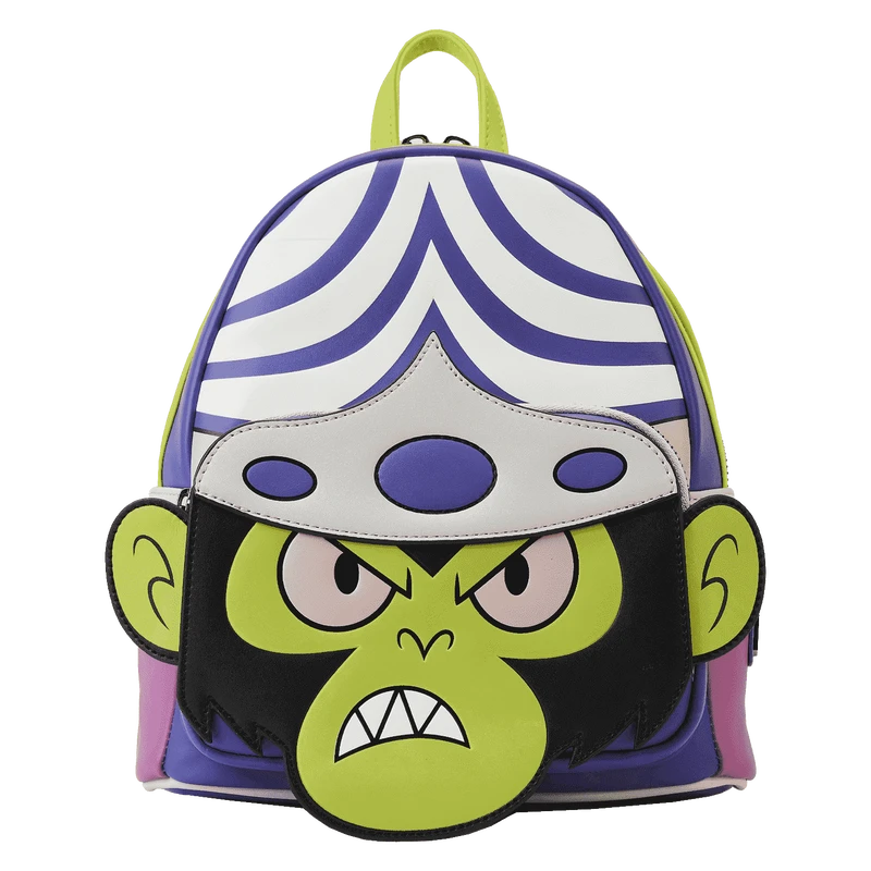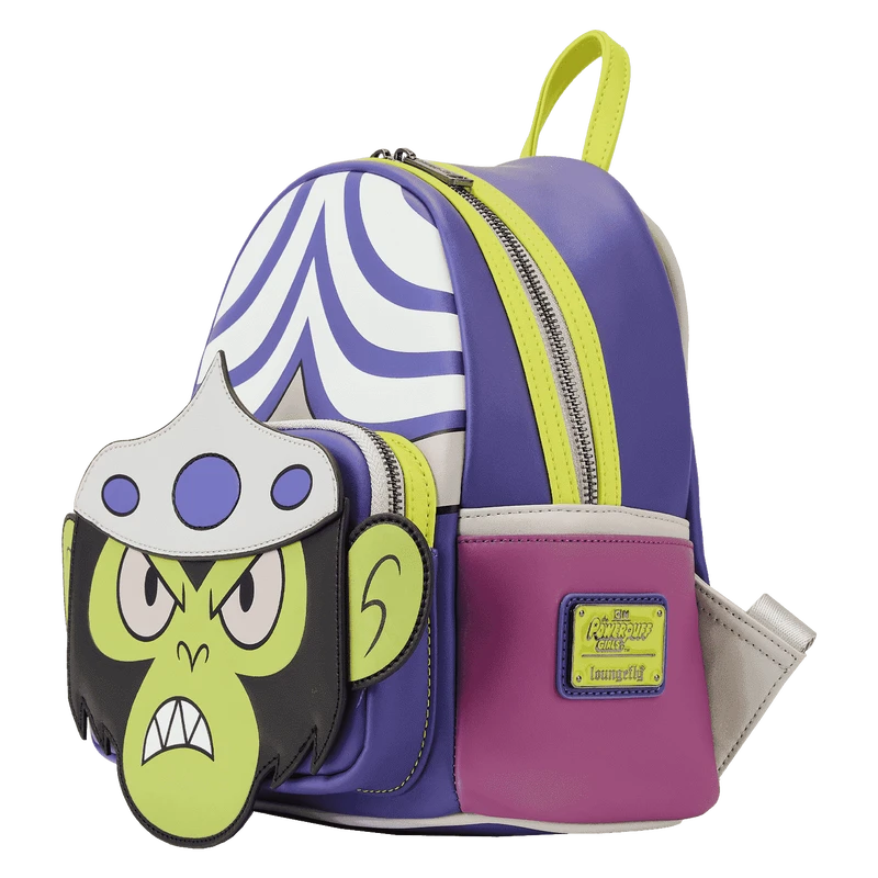 The Loungefly Powerpuff Girls Mojo Jojo Cosplay Mini Backpack is made of vegan leather (polyurethane). Bag has adjustable shoulder straps and shiny silver hardware. Additional features include applique, debossed, embroidered, glow-in-the-dark, and printed details. Take note of the coordinating inside lining.