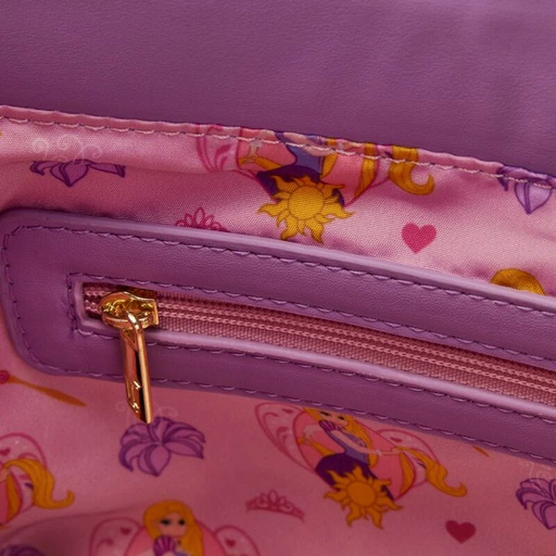 The Loungefly Rapunzel Princess Scene Crossbody Bag is made of vegan leather (polyurethane). Bag has adjustable (detachable) shoulder strap, sturdy metal hardware, and features printed details. Take note of the coordinating inside lining.