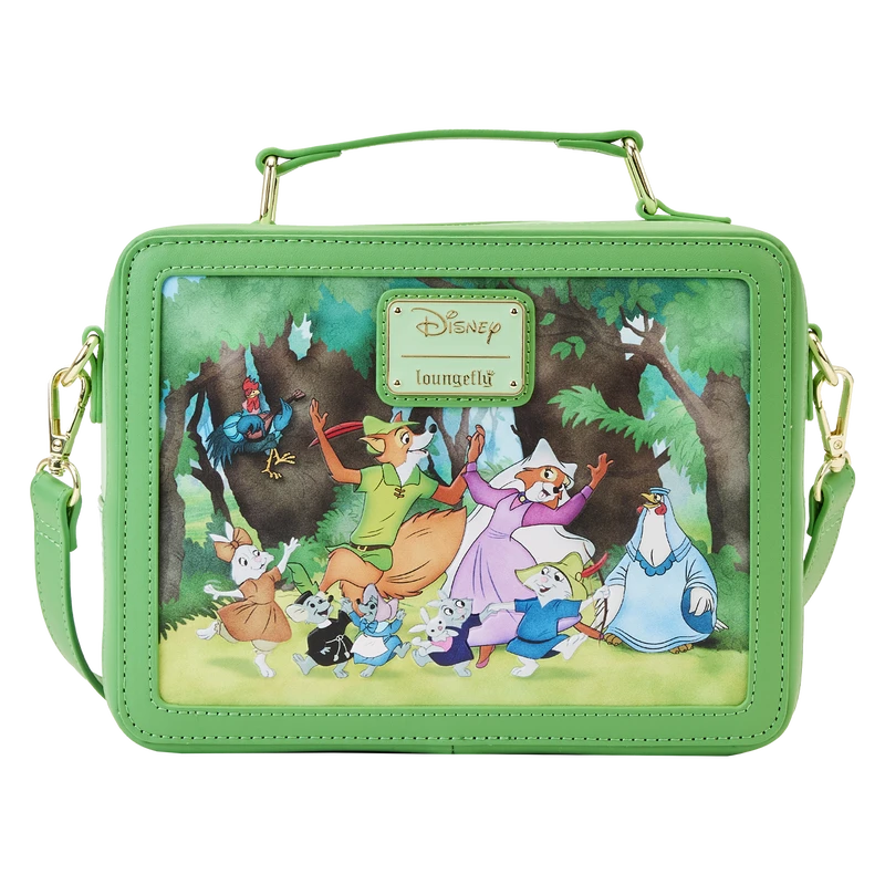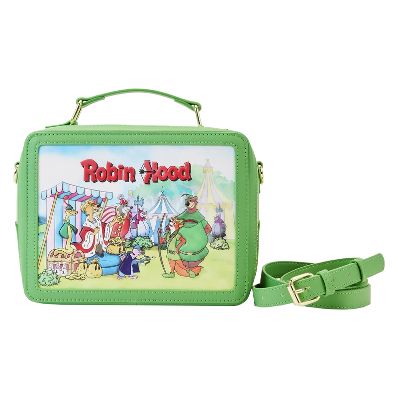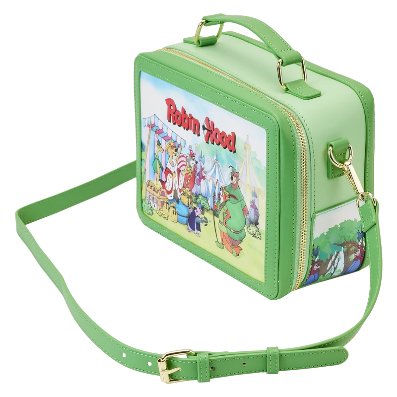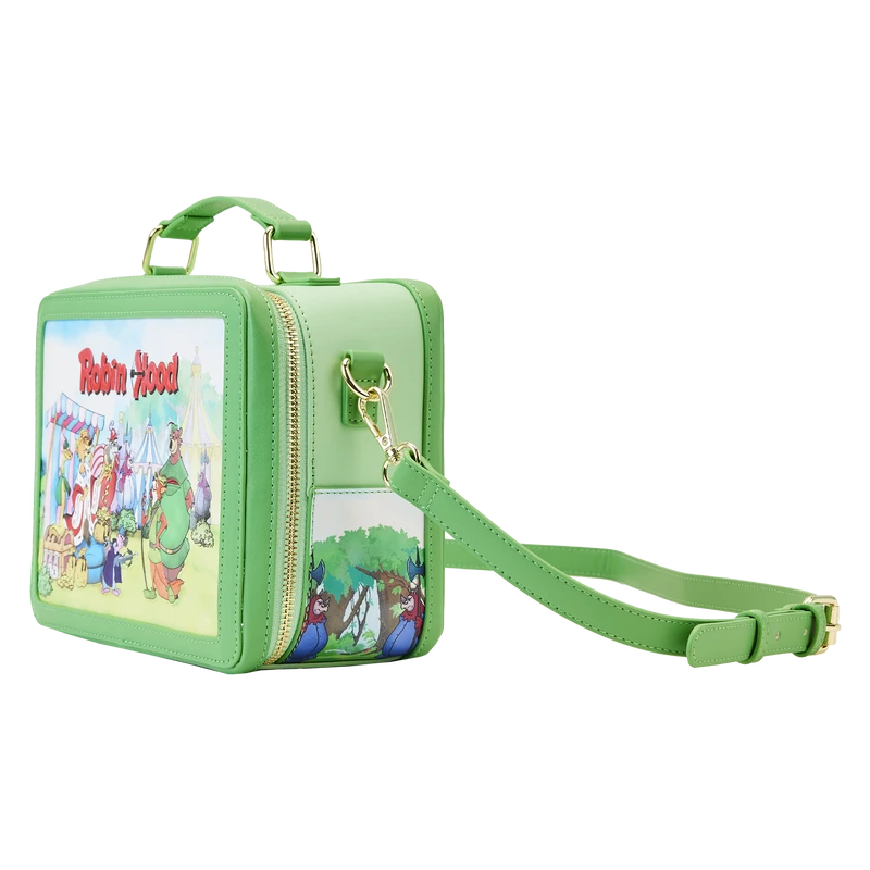 The Loungefly Disney Robin Hood Lunchbox Crossbody Bag is made of vegan leather (polyurethane). Bag has adjustable (detachable) shoulder strap with sturdy gold-colored metal hardware and features printed and debossed details. Take note of the coordinating inside lining.