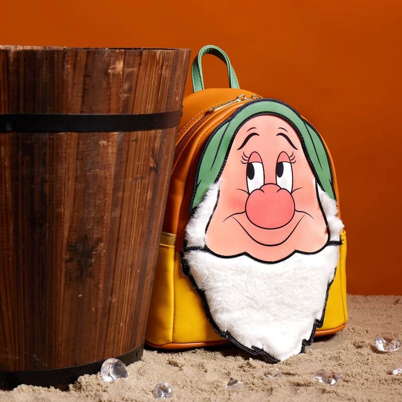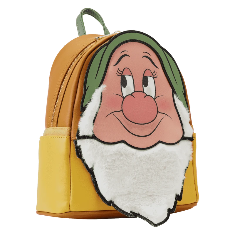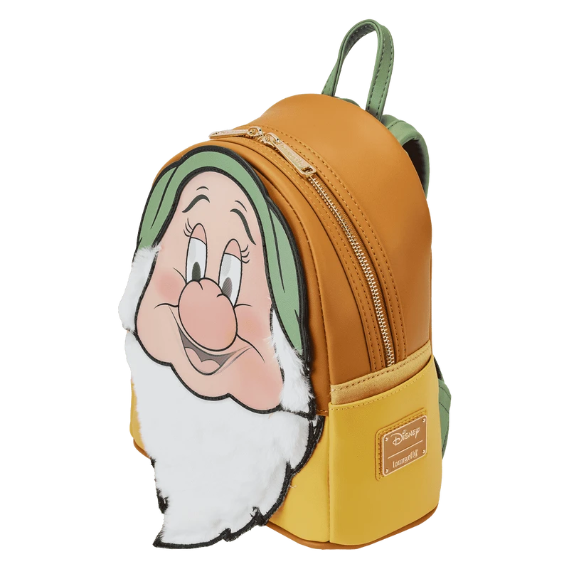Backpack features include shiny gold-colored metal hardware, adjustable straps, vegan leather (polyurethane), side pockets, and applique, debossed, faux fur, lenticular, and printed details. Note the coordinating lining.