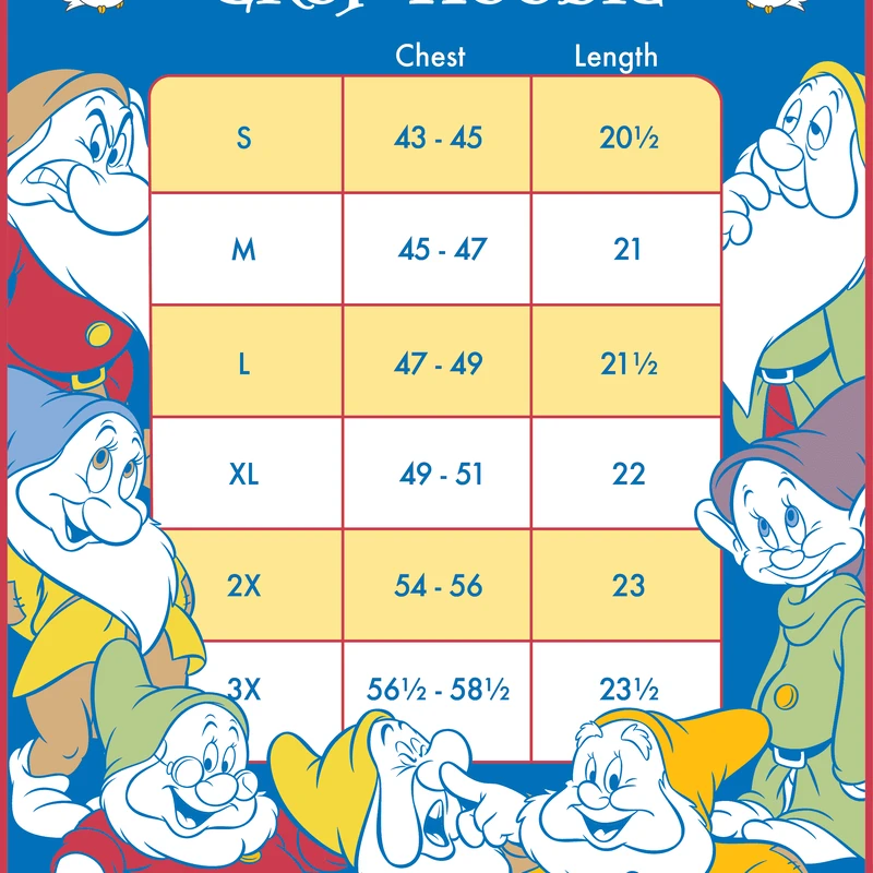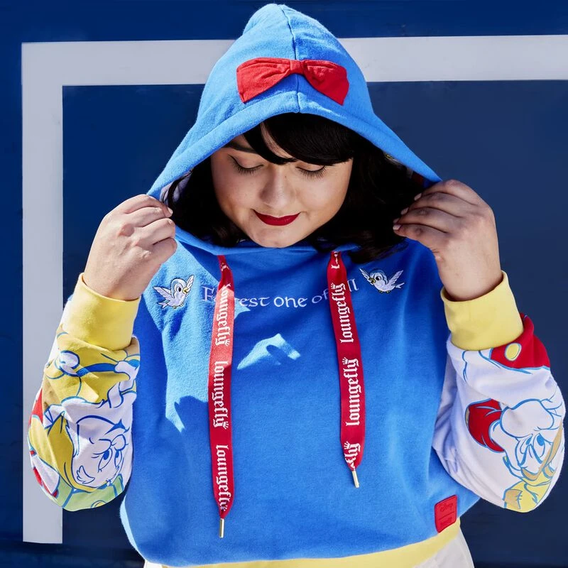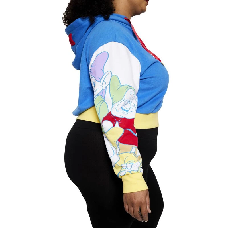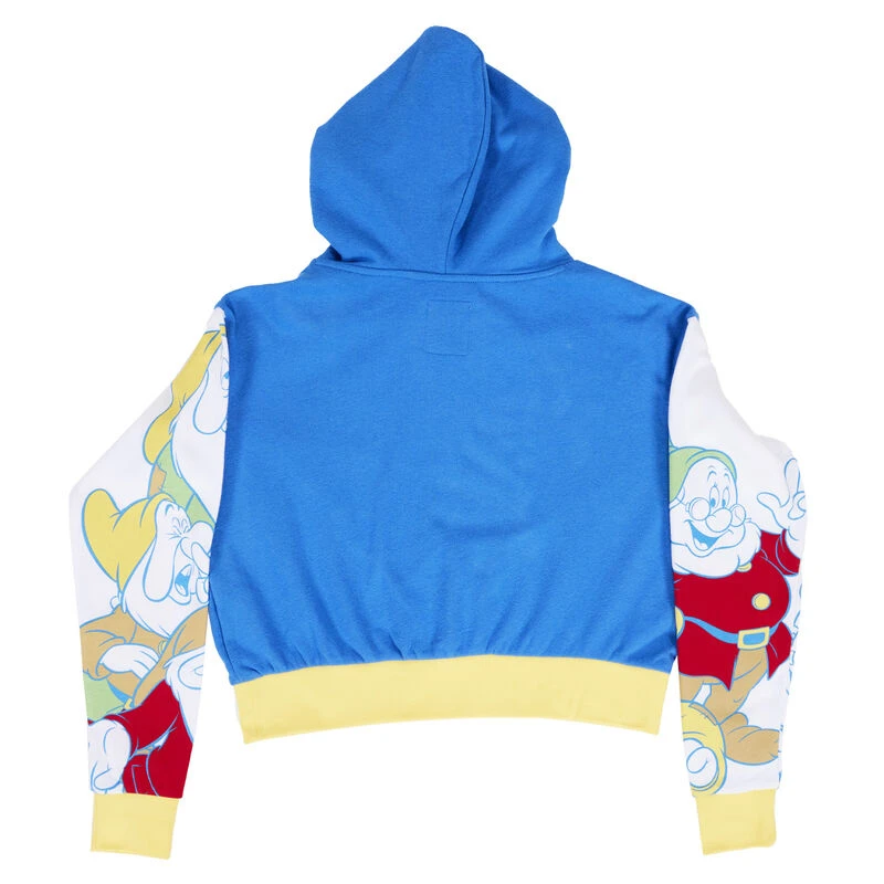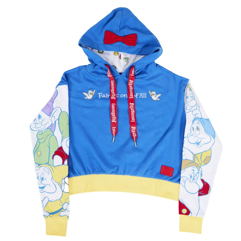 Live happily and comfortably ever after in this Loungefly Snow White Fairest One of All Crop Hoodie. Wrap up your adventures in a bright red bow as you enjoy a favorite outing while wearing this super soft hoodie. The Seven Dwarfs, screen printed on the sleeves, accompany you wherever you go. On the front of the blue hood, Snow White’s iconic red bow appears. The embroidered words “Fairest one of All” recall Snow White’s triumph over the Evil Queen. The cropped fit makes it perfect for pairing with cute joggers, leggings, jeans or high-waisted pants or leggings.