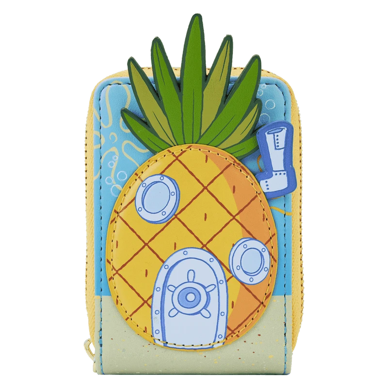 The Loungefly SpongeBob SquarePants Pineapple House Accordion Wallet is made of vegan leather (polyurethane). Wallet zips closed with sturdy metal hardware. Additional features include applique, debossed, and printed details. Take note of the coordinating inside lining.