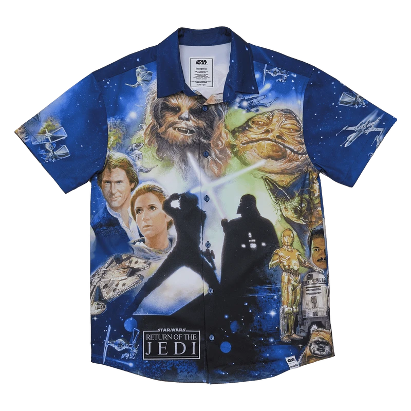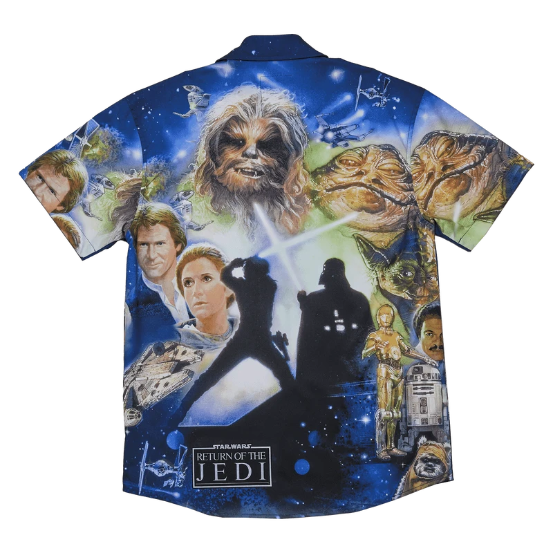 This short sleeve shirt is made of a soft fabric blend (93% polyester, 7% Spandex) and buttons down the center front. Wear this versatile top tucked in, loose, or tied to bring a variety of styles to your fandom wardrobe.