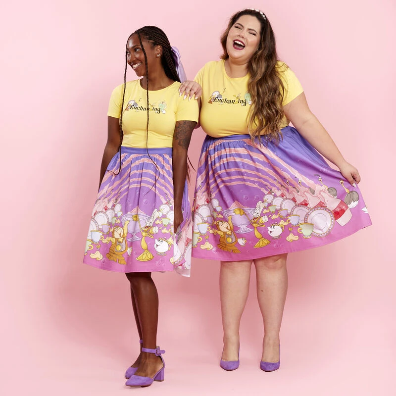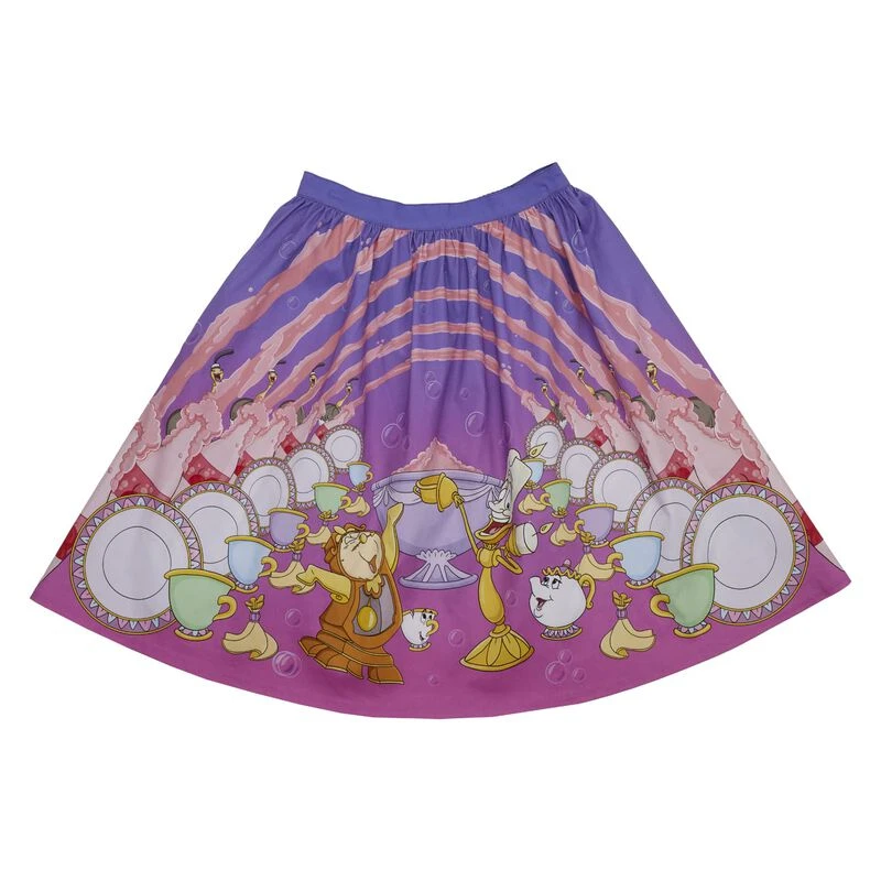 Bring the magic of your favorite fairytale to life with the Stitch Shoppe by Loungefly Be Our Guest Sandy Skirt. The pattern recreates the grand finale from the catchy tune featured in Disney’s Beauty and the Beast, with Cogsworth, Chip, Lumiere, and Mrs. Potts singing under a regal chandelier and bubbly champagne arches.