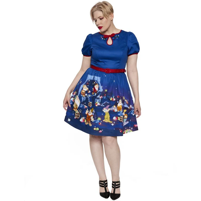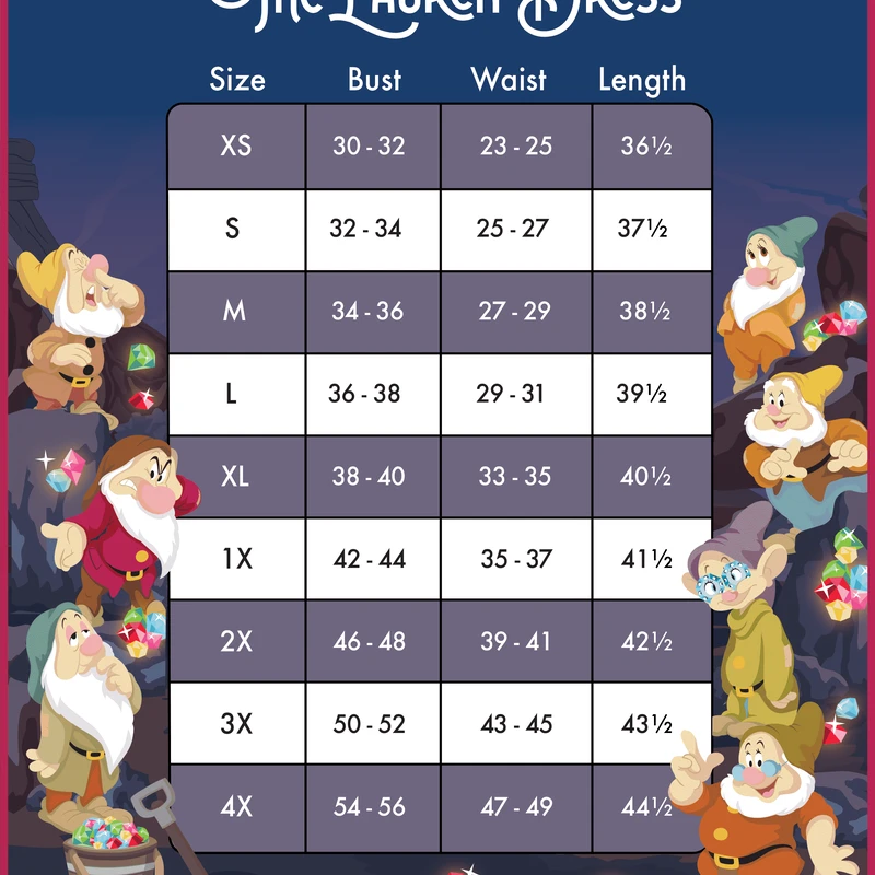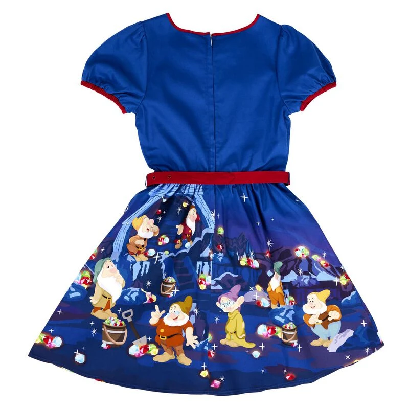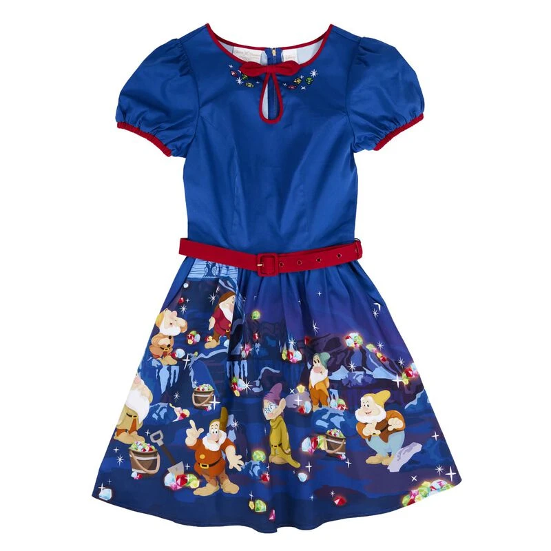 A gem of a hem glitters with diamonds in the rough. When the Seven Dwarfs work together, treasures abound. Let them add sparkle to your wardrobe with this Disney Stitch Shoppe Snow White Lauren Dress. This dress features a red-ribbon keyhole top, pockets, puffed quarter sleeves, and a scoop neck. Embroidered gems grace the neckline. All along the hem of the dress, the Seven Dwarfs uncover shiny, precious stones, all in a day’s work.