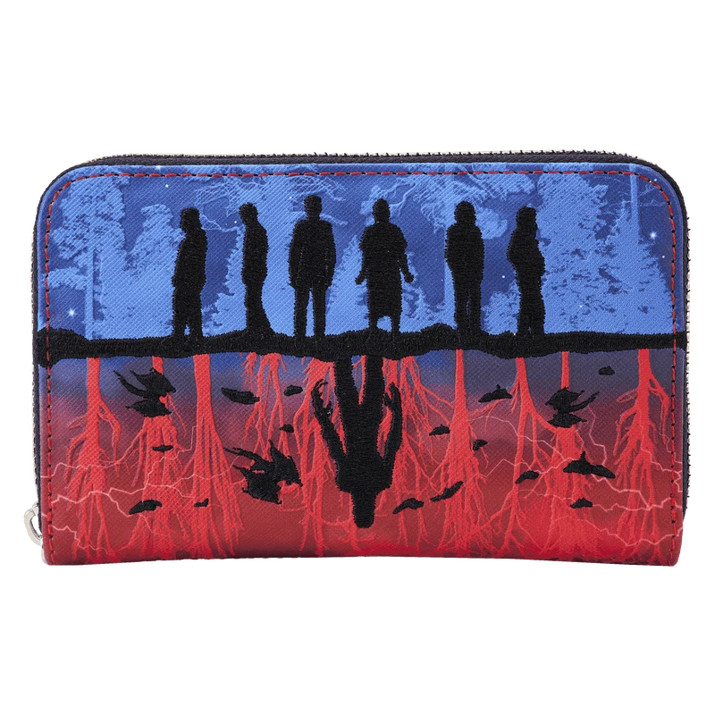 The Loungefly Netflix Stranger Things Upside Down Shadows Zip-Around Wallet is made of vegan leather (polyurethane). Wallet zips closed with shiny silver-colored metal hardware. Additional features include applique, embroidered, debossed, and printed details. Take note of the coordinating inside lining.