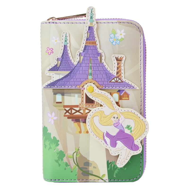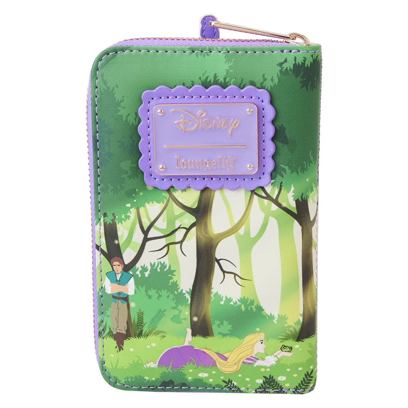 The Loungefly Disney Tangled Rapunzel Swinging from the Tower Zip-Around Wallet is made of vegan leather (polyurethane). Wallet zips closed with shiny rose gold-colored metal hardware. Additional features include a rivet for moveable details and applique, debossed, and printed details. Take note of the coordinating inside lining.