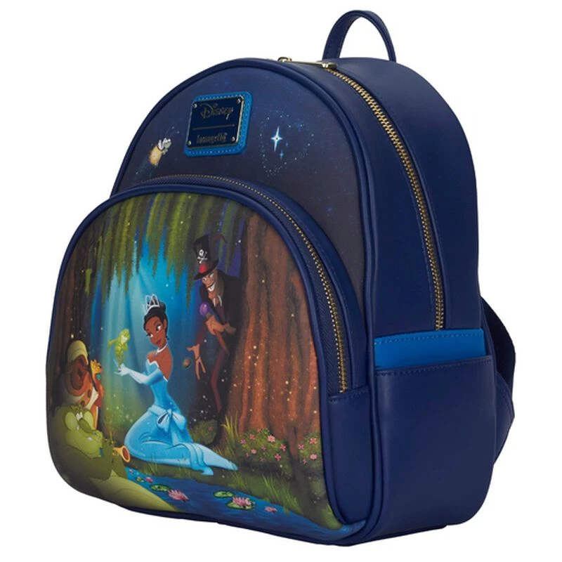 The Loungefly Exclusive – The Princess and the Frog Bayou Scene Light Up Mini Backpack is made of vegan leather (polyurethane) with faux suede trim. Bag has adjustable shoulder straps, side pockets, sturdy metal hardware, and features: light-up, embroidered, and printed details. Take note of the coordinating pattern of the inside lining fabric.