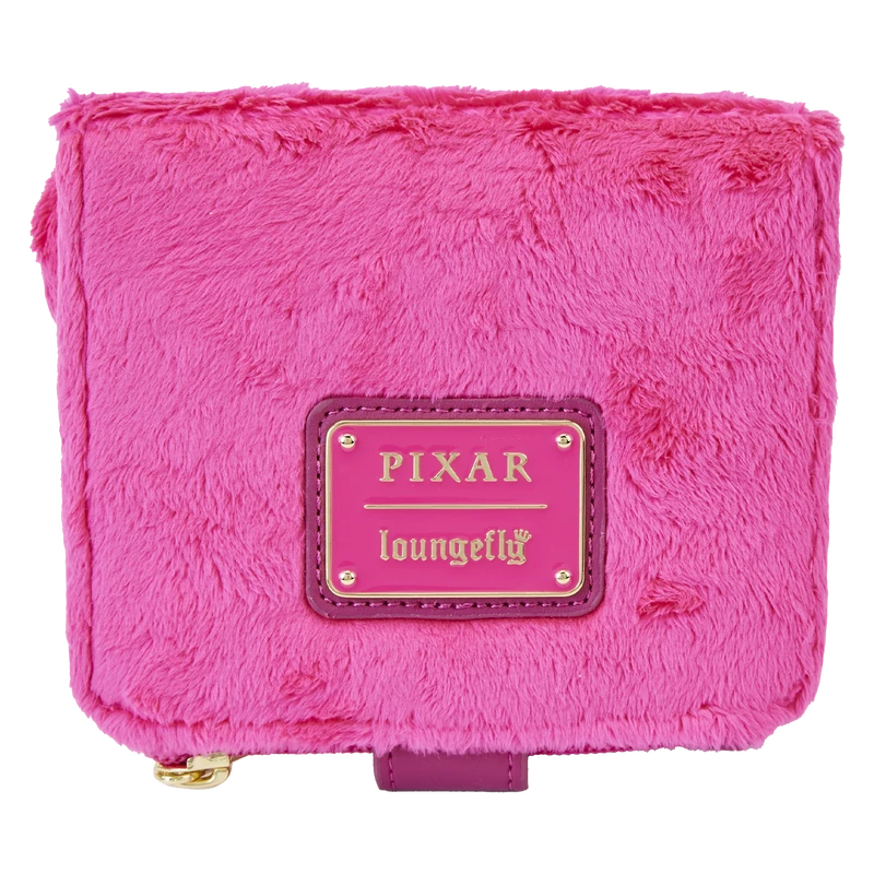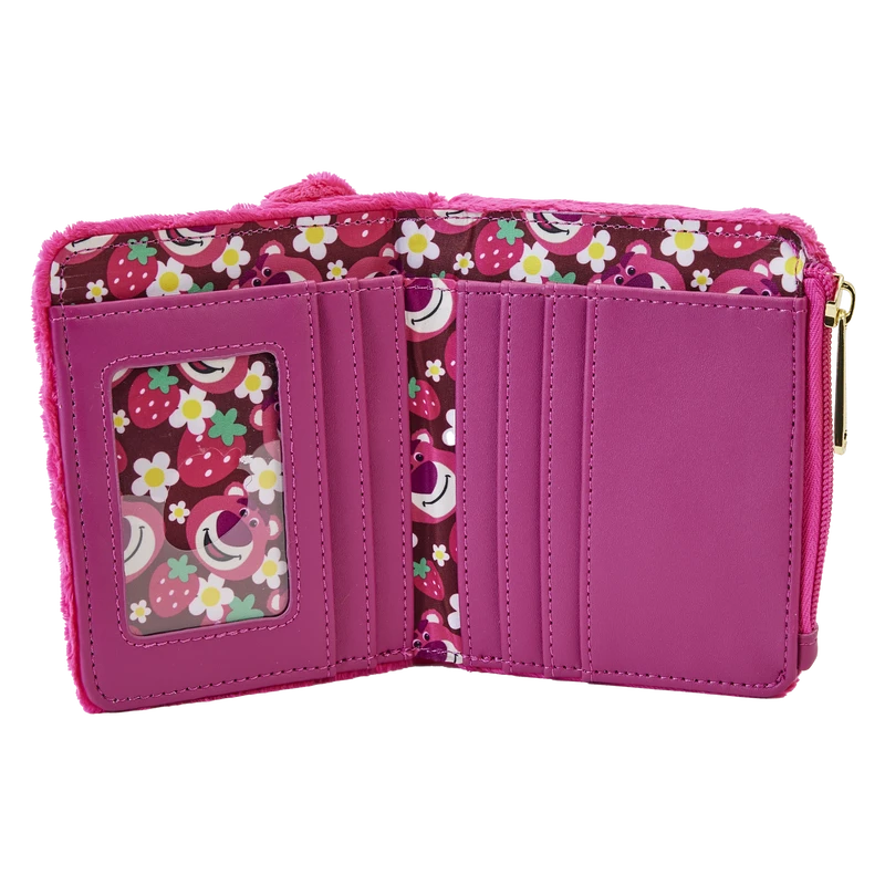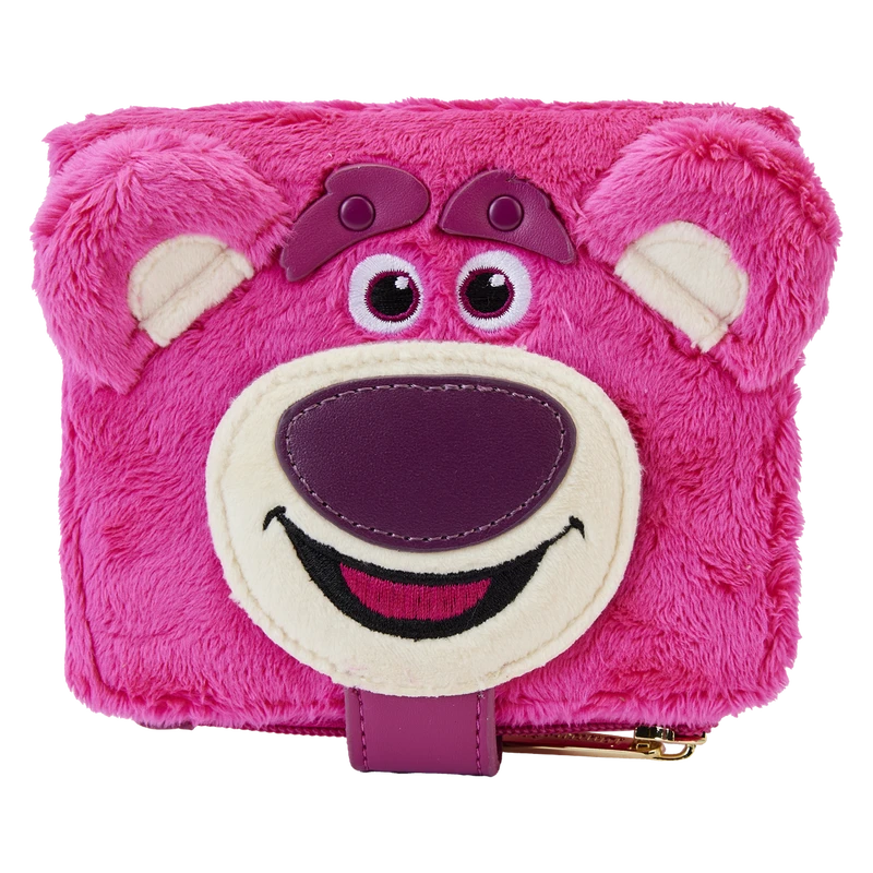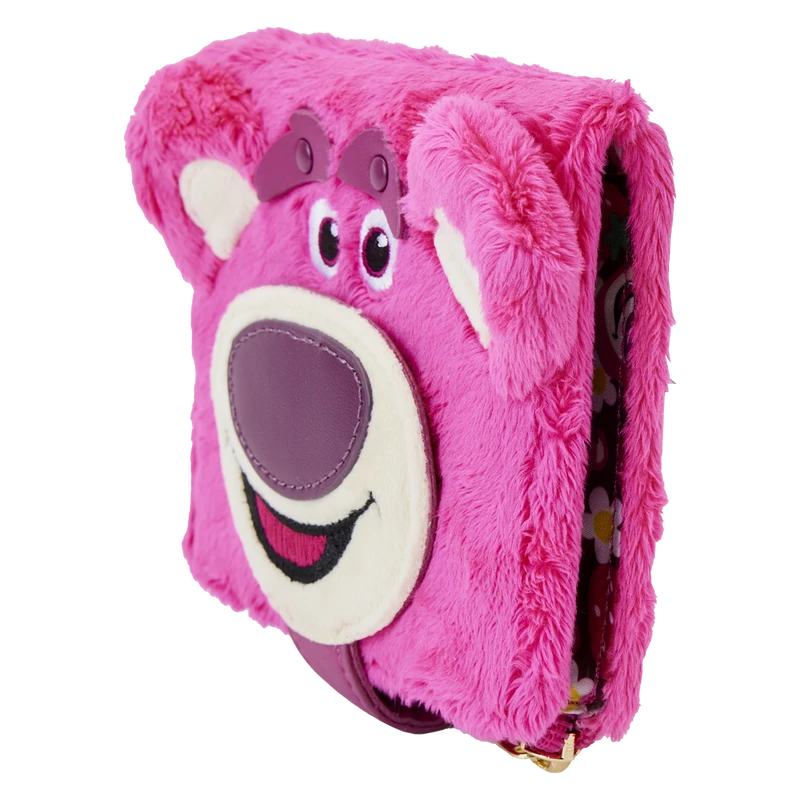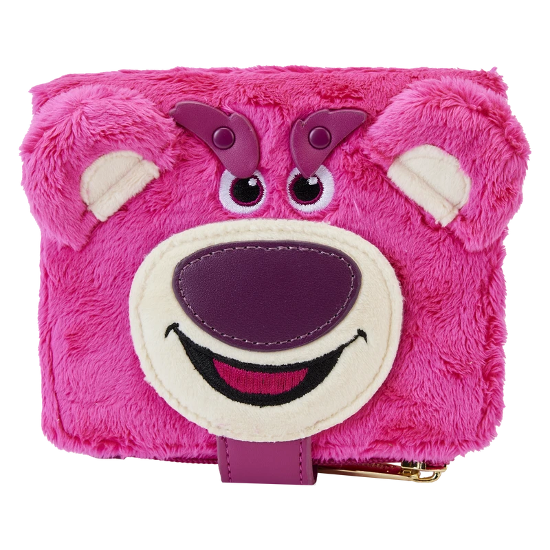 The exclusive Loungefly Toy Story Lotso Plush Bifold Wallet is made of plush with vegan leather (polyurethane) trim. Wallet snaps closed with sturdy metal hardware. Additional features include applique, embroidered, scented, and printed details. Take note of the coordinating inside lining.