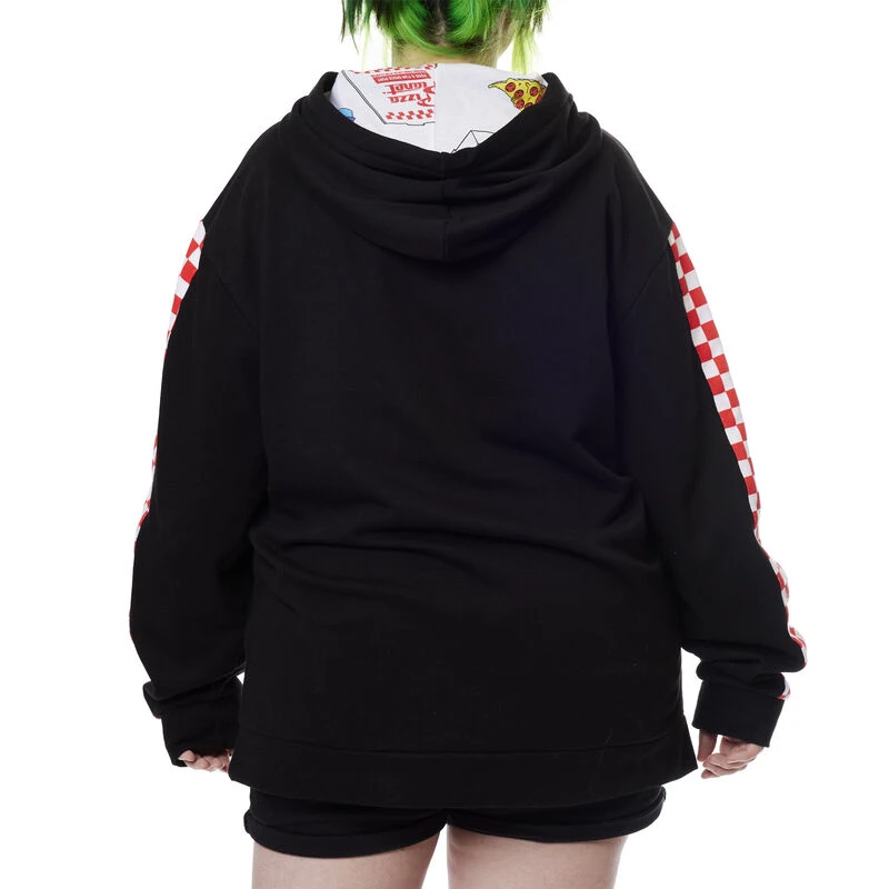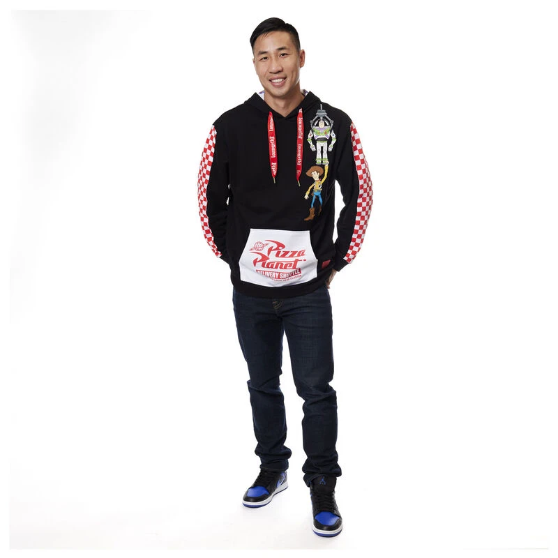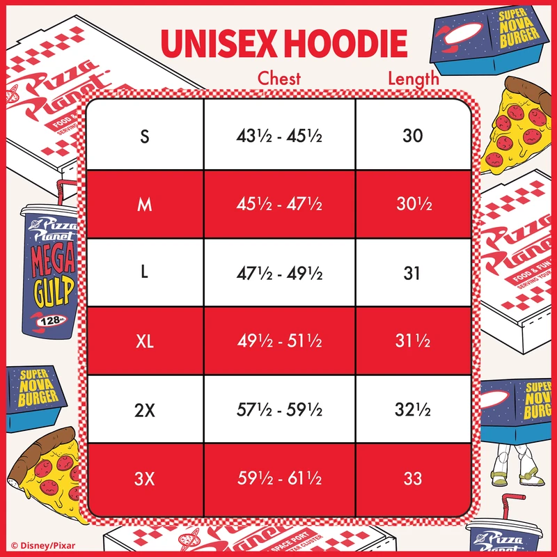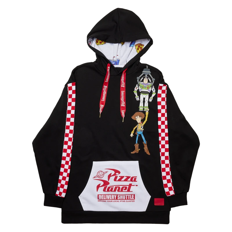 The Loungefly Toy Story Pizza Planet Unisex Hoodie is made of French Terry cotton (60% cotton, 40% polyester). Extra-large lanyard-style drawcords add versatility in wear and fit and are perfect for displaying your favorite pins. Cuffs and waistband are 95% cotton and 5% Spandex.
