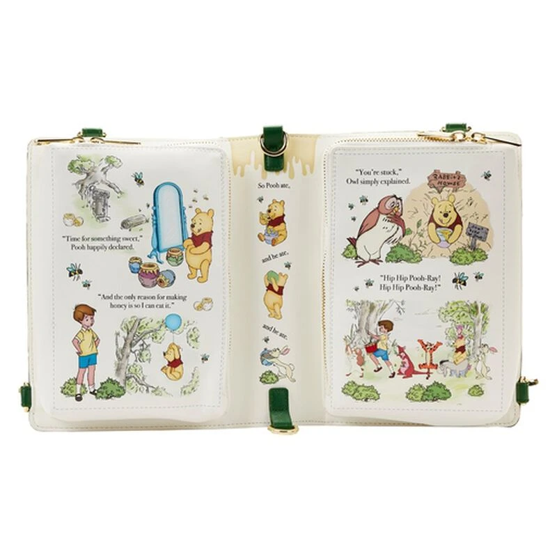 Book a delightful trip to the Hundred Acre Wood with this Loungefly Disney Winnie the Pooh Classic Book Cover Convertible Crossbody Bag. On the outside, Winnie the Pooh comes to life in glorious color detail, suspended from a balloon as he travels over an outline-map of the Hundred Acre Wood. When the “book” is opened, you’ll see some familiar character scenes and famous lines come to life in print. Even the spine, down the middle of the opened “page,” contains delicious details, including a bucket of honey at the top that pours down the center—and more scenes of Pooh and Rabbit. On the back, Winnie the Pooh makes another appearance with his bucket of honey and a few bees. Join Winnie the Pooh, Christopher Robin, Kanga, Roo, Tigger, Eeyore, Owl, Piglet, and Rabbit on all kinds of sweet-as-honey adventures. Capture a favorite Disney moment and keep it close—or turn everyday adventures into sweet memories.