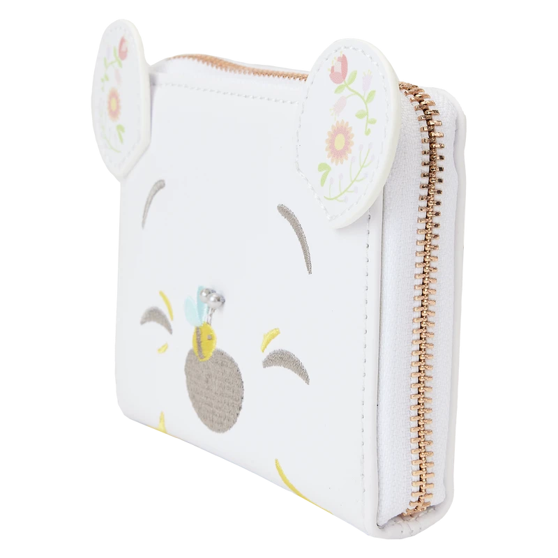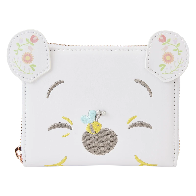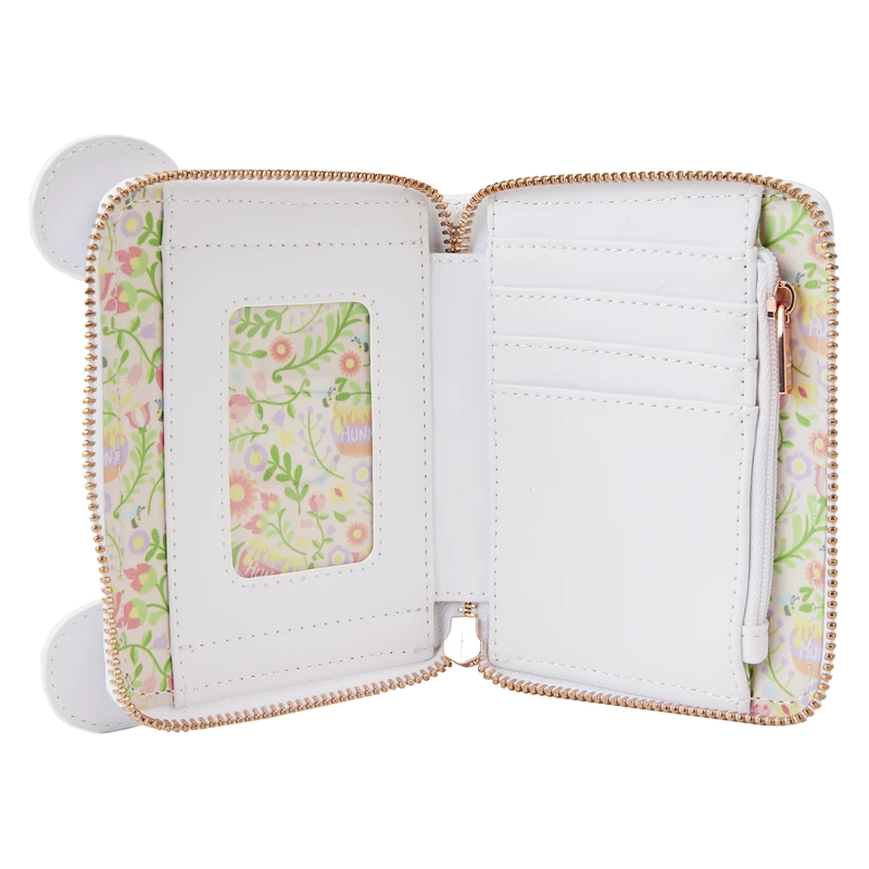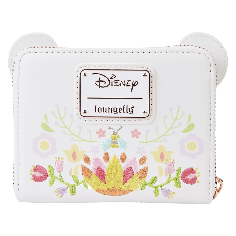 The Loungefly Disney Winnie the Pooh Cosplay Folk Floral Zip-Around Wallet is made of vegan leather (polyurethane). Wallet zips closed with rose gold-colored metal hardware. Additional features include applique, embroidered, beaded, and printed details. Take note of the coordinating inside lining.